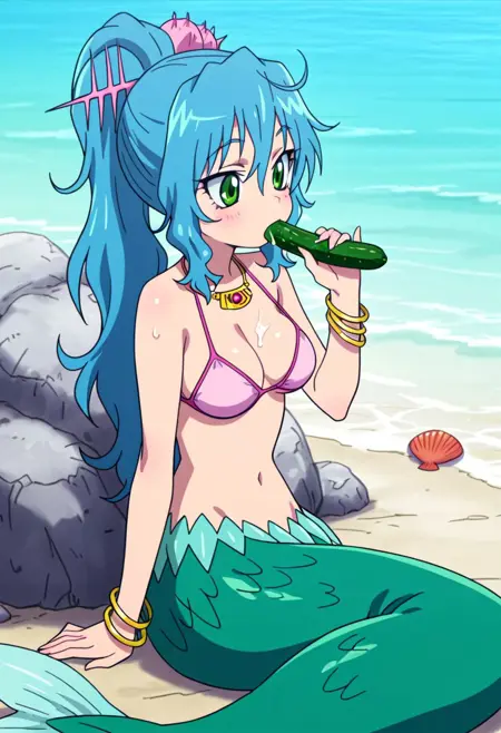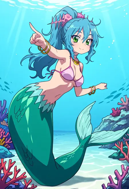 外見: 青髪、緑目、長髪、ポニーテール、髪飾り、貝殻、中程度の胸、モンスターガール、人魚、人魚の尾、緑の尾
