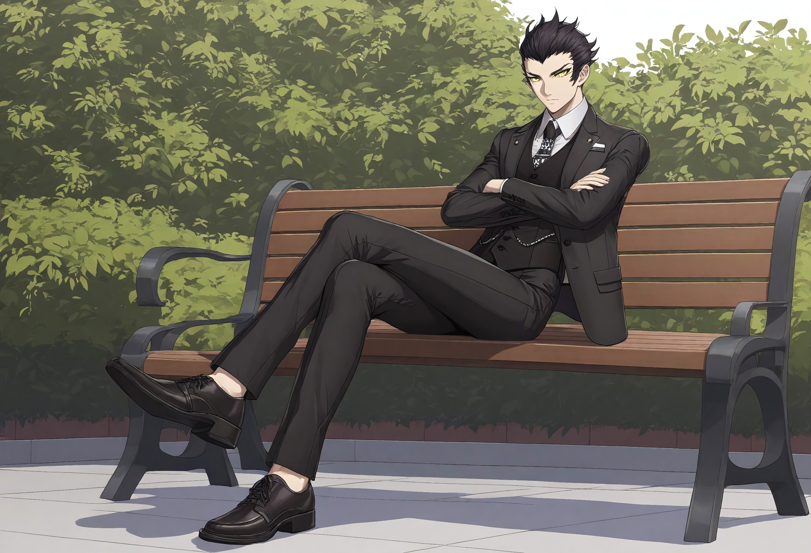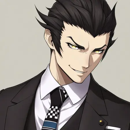 hayao_koshimizu, black suit, black hair, yellow eyes