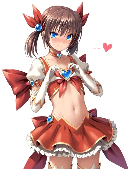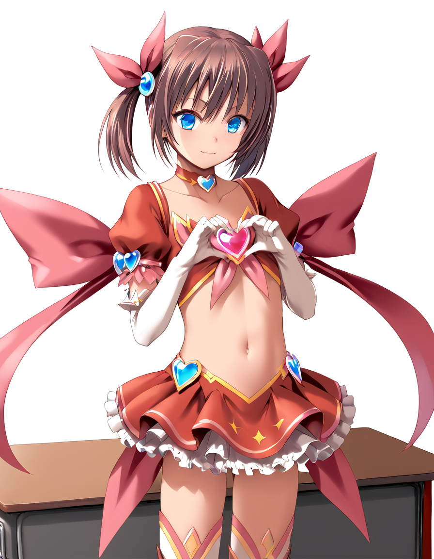 skirt, thighhighs, gloves, white background, bow, ribbon, navel, choker, elbow gloves, midriff, magical girl