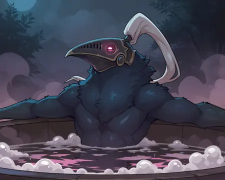 (kenku, bell toll, corvid, crow:1.35), long beak, glowing eyes, pink eyes