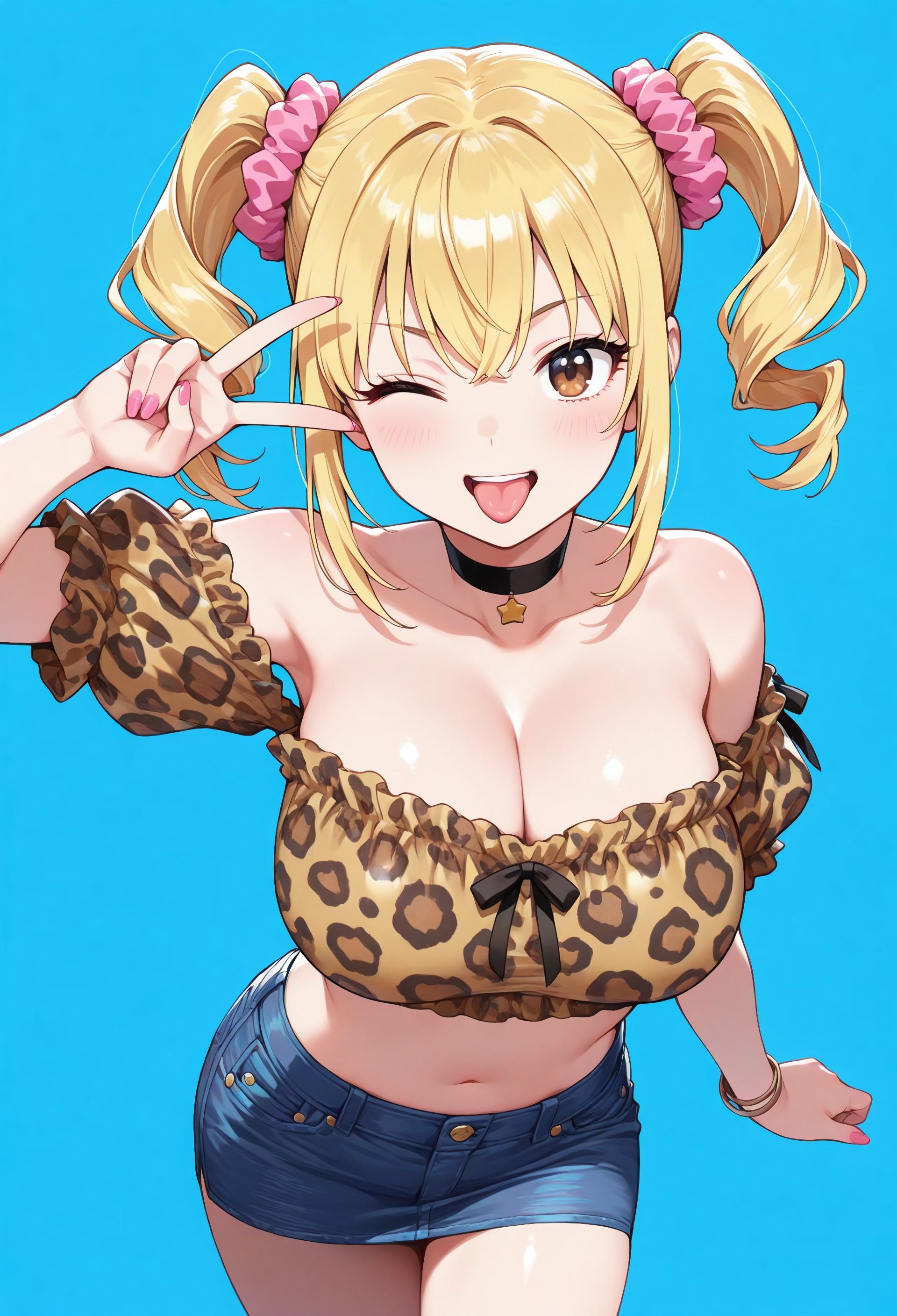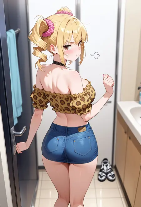 发圈, 项圈, 短款上衣, 豹纹, 肩部露空, 蓬松脱落袖子, 牛仔裙, 超短裙, 运动凉鞋