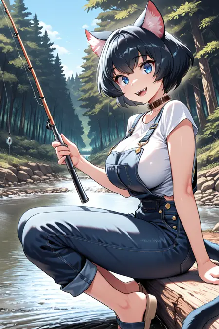 Trigger word is "shmiri" and "cat ears, black hair, short hair, blue eyes, cat tail" is required.