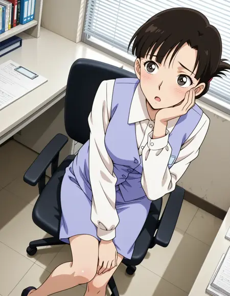 light purple vest, white collared shirt,long sleeves, light purple pencil skirt, brown heels,formal,