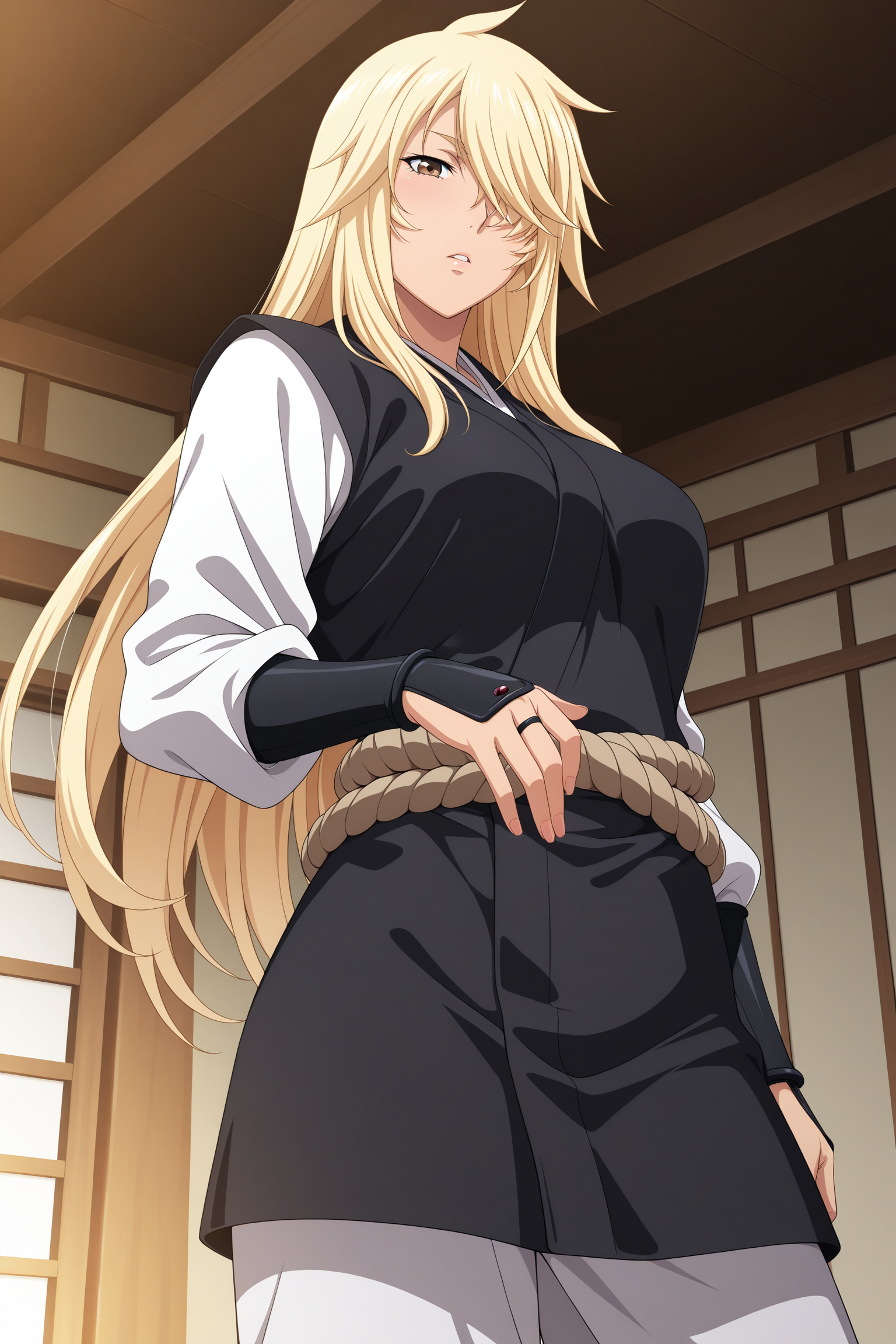 musashibou benkei, long hair, blonde hair, hair over one eye, sidelocks, brown eyes, long sleeves, white shirt, black kimono, sleeveless jacket, long jacket, wrist guards, bridal gauntlets, rope, rope around waist, white pants, shin guards, tabi, geta