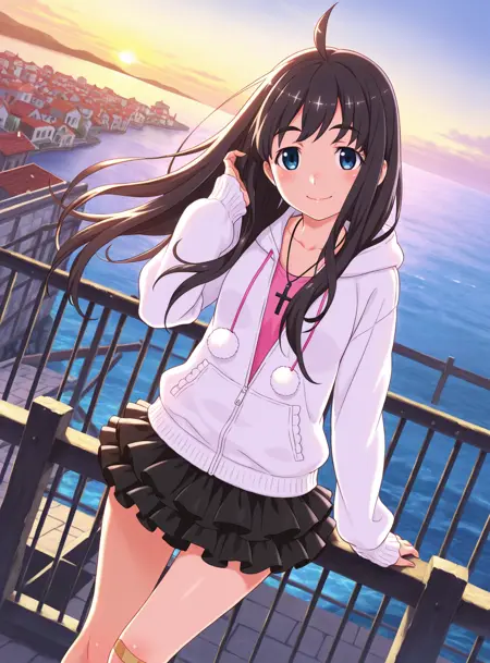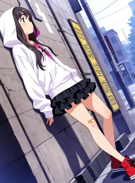 cross pendant, hoodie, layered skirt, bandaid on knee,