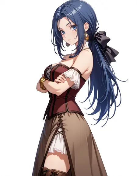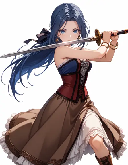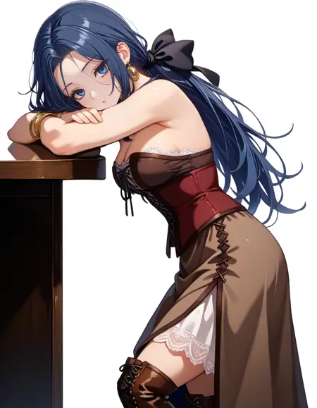 다크브라운 드레스, 양팔에 팔찌, 레드 코셋, 다크브라운 스커트, 골드 귀걸이, 부츠, 브라운 신발, 레이스업 부츠, 화이트 내부 스커트,