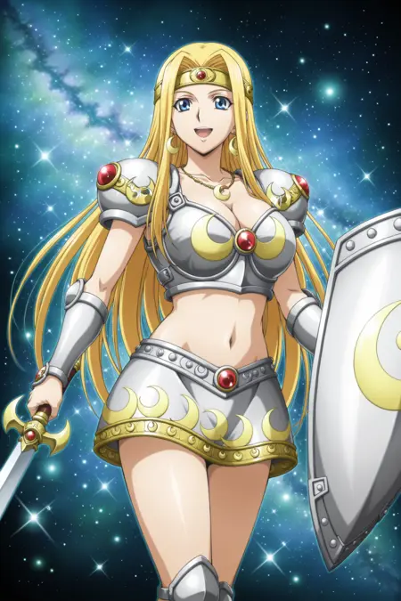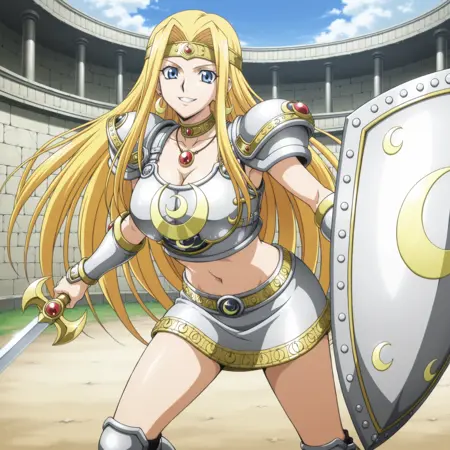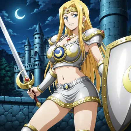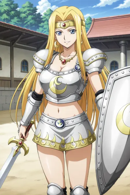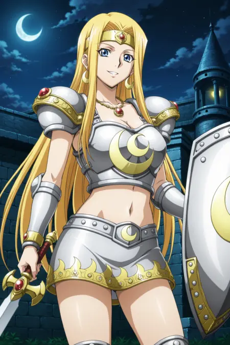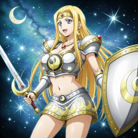 yugioh_card_style, yugioh_card_for_penumbral_soldier_lady, blue eyes, blonde hair, long straight hair, flowing hair, earrings, necklace, large breasts, collarbone, navel, cleavage, smile, golden headband, red gem, metal breastplate, metallic vambraces, silver armor, moon emblem on chest, armored shoulder pads, armored miniskirt, crescent moon pattern, golden trims, armored thigh guards, crescent sword, silver and gold shield, crescent moon shield, left hand shield, right hand sword