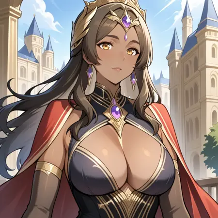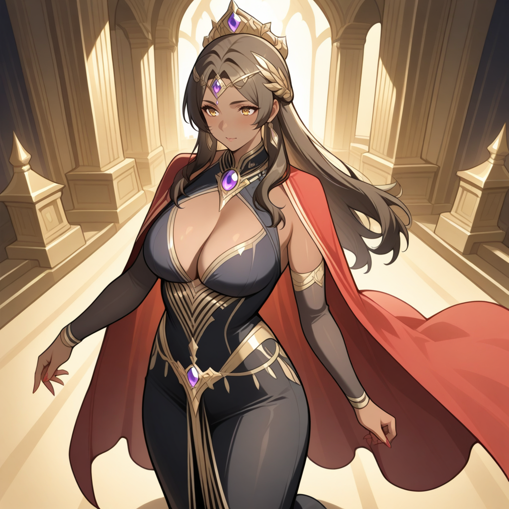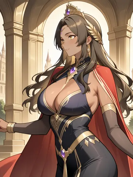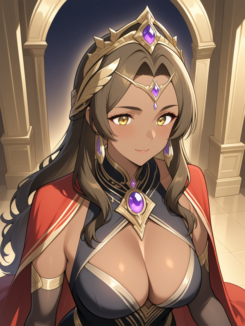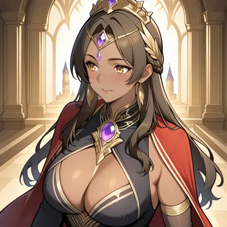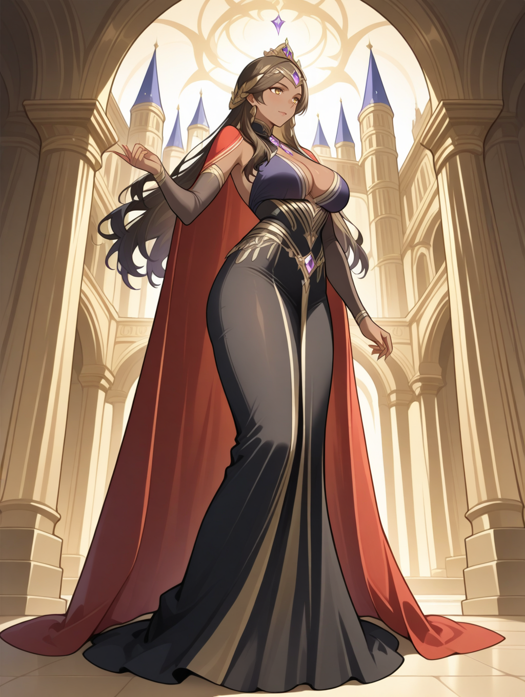 提示示例:tatiana,tatiana,tatiana,成熟女性,黑色长发,金色发饰,紫色宝石,红色斗篷,露胸剪裁,可拆卸袖子,黑色连衣裙,金色镶边,棕色皮肤,小麦色,中等大小胸部,