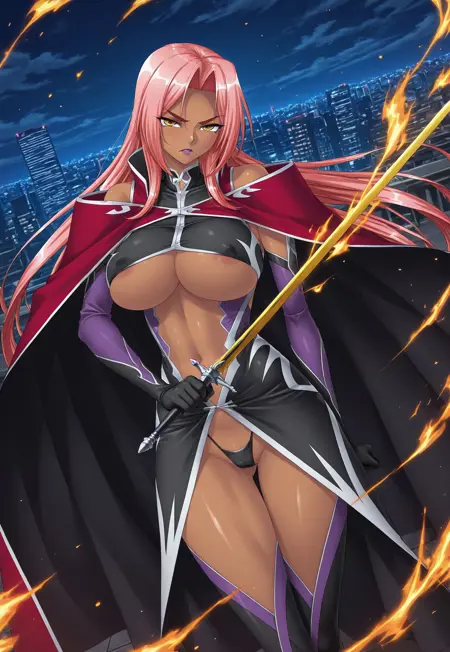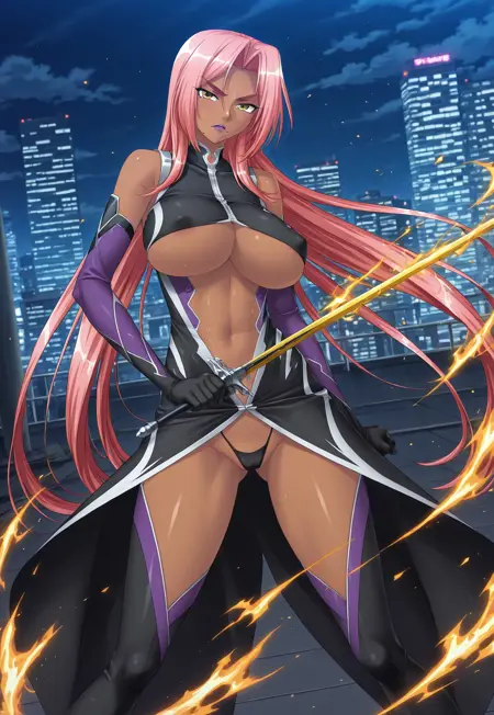 タグ:1girl、成熟した女性、セクシー、くびれがある、ツヤのある肌、イングリッド \(taimanin murasaki\)、長い髪、ピンクの髪、髪の巻き、黄色い目、暗い肌の女性、暗い肌、メイク、紫色の唇、リップストップ、ほくろ、口の下のほくろ、大きな胸、