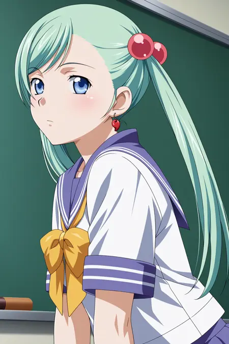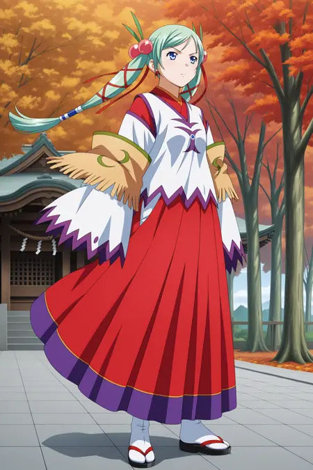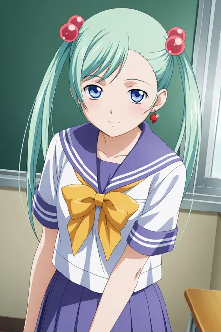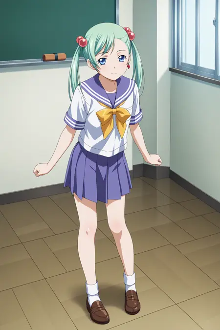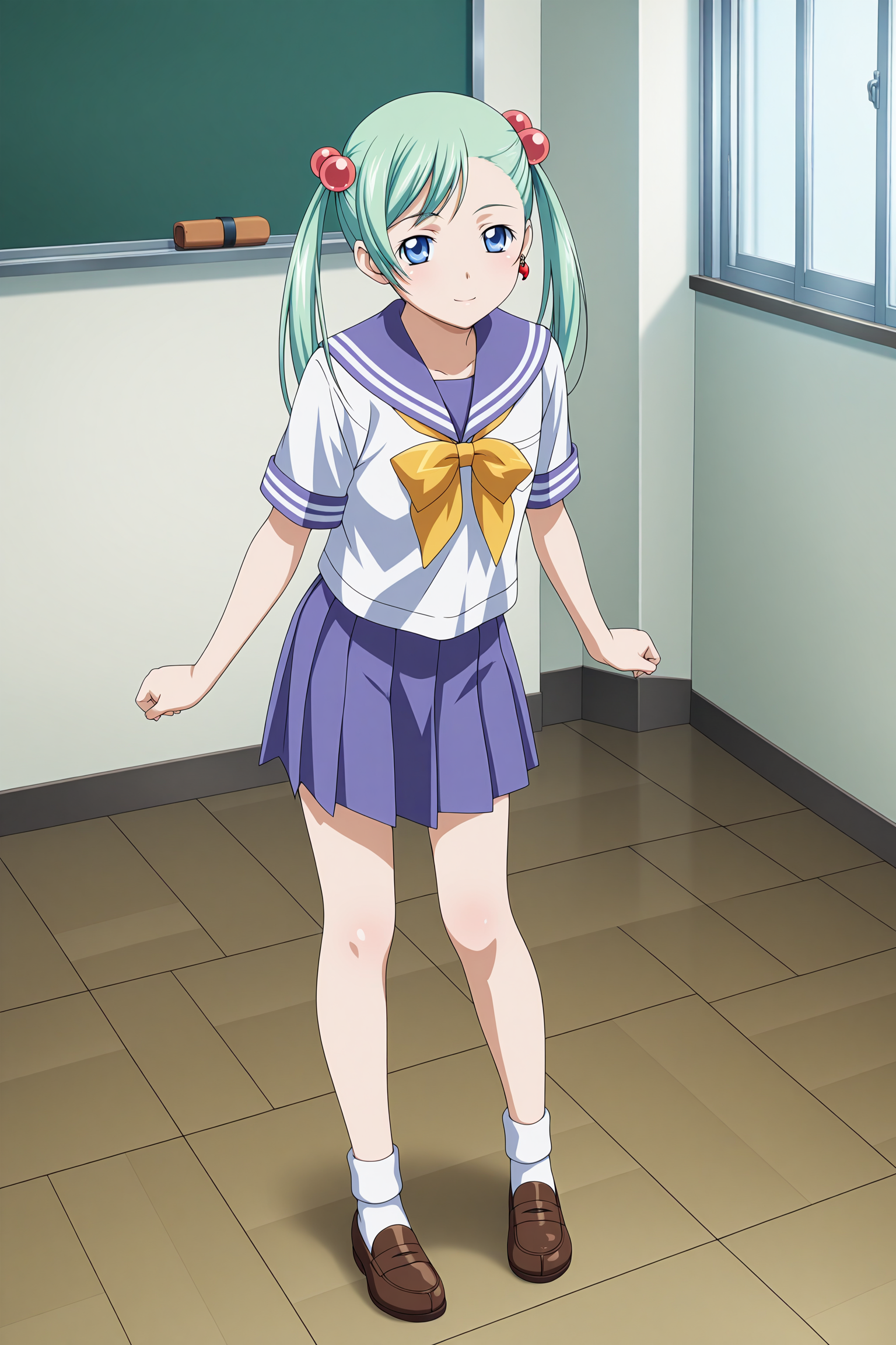 shokatsuryou koumei, long hair, green hair, twintails, hair bobbles, asymmetrical bangs, blue eyes, magatama earrings, single earring, short sleeves, yellow bowtie, purple sailor collar, purple skirt, pleated skirt, white socks, ankle socks, brown footwear, loafers