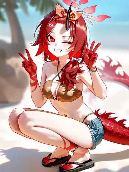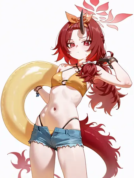 renge (swimsuit) (blue archive), 1girl, solo, dragon girl, single horn, red eyes, long hair, red hair, small breasts, n bikini under shorts, blue shorts, denim shorts, official alternate costume, yellow bikini, red halo,
