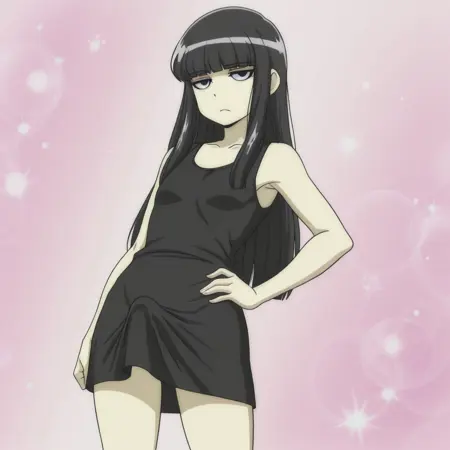 shinobursmp, pale female with light yellowish skin, long black hair, hime cut, simple small black eyes