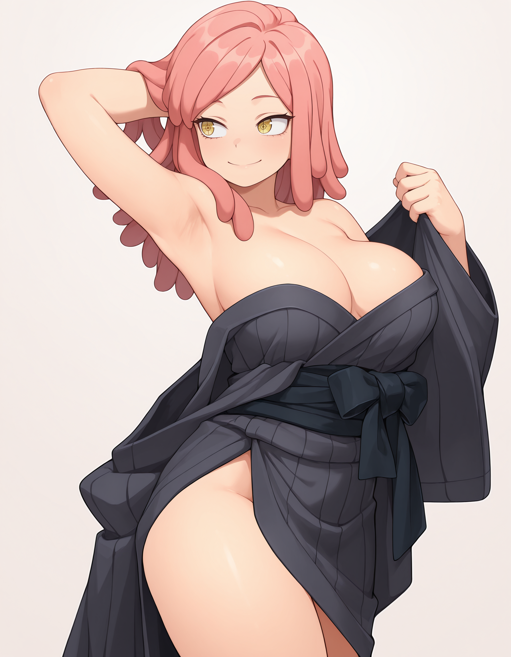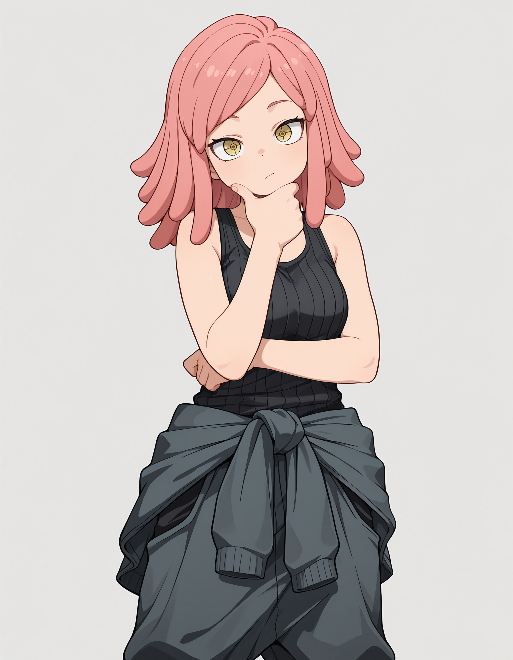 m3i, pink hair, yellow eyes, symbol-shaped pupils,