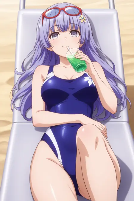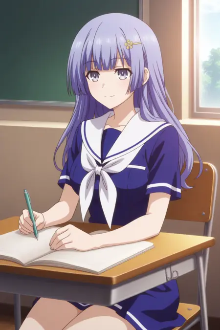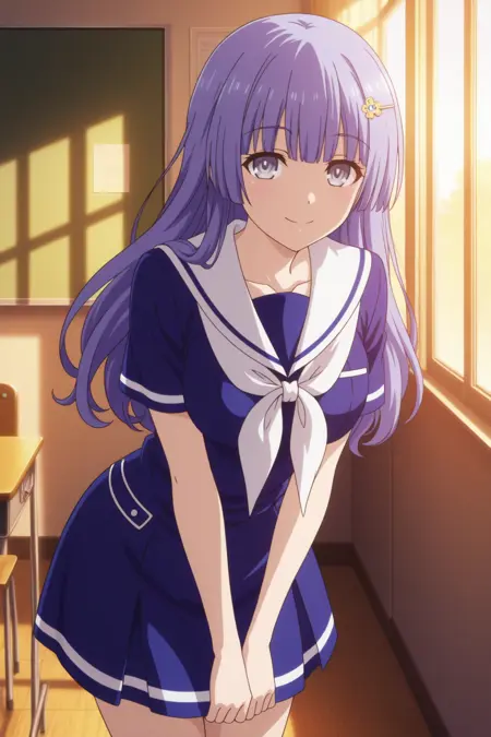 aamiku, 紫色头发, 灰色眼睛, mikuschool, 发夹, 校服, 白色水手领, 白色领巾, 蓝色水手服, 短袖, 动漫着色,