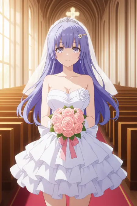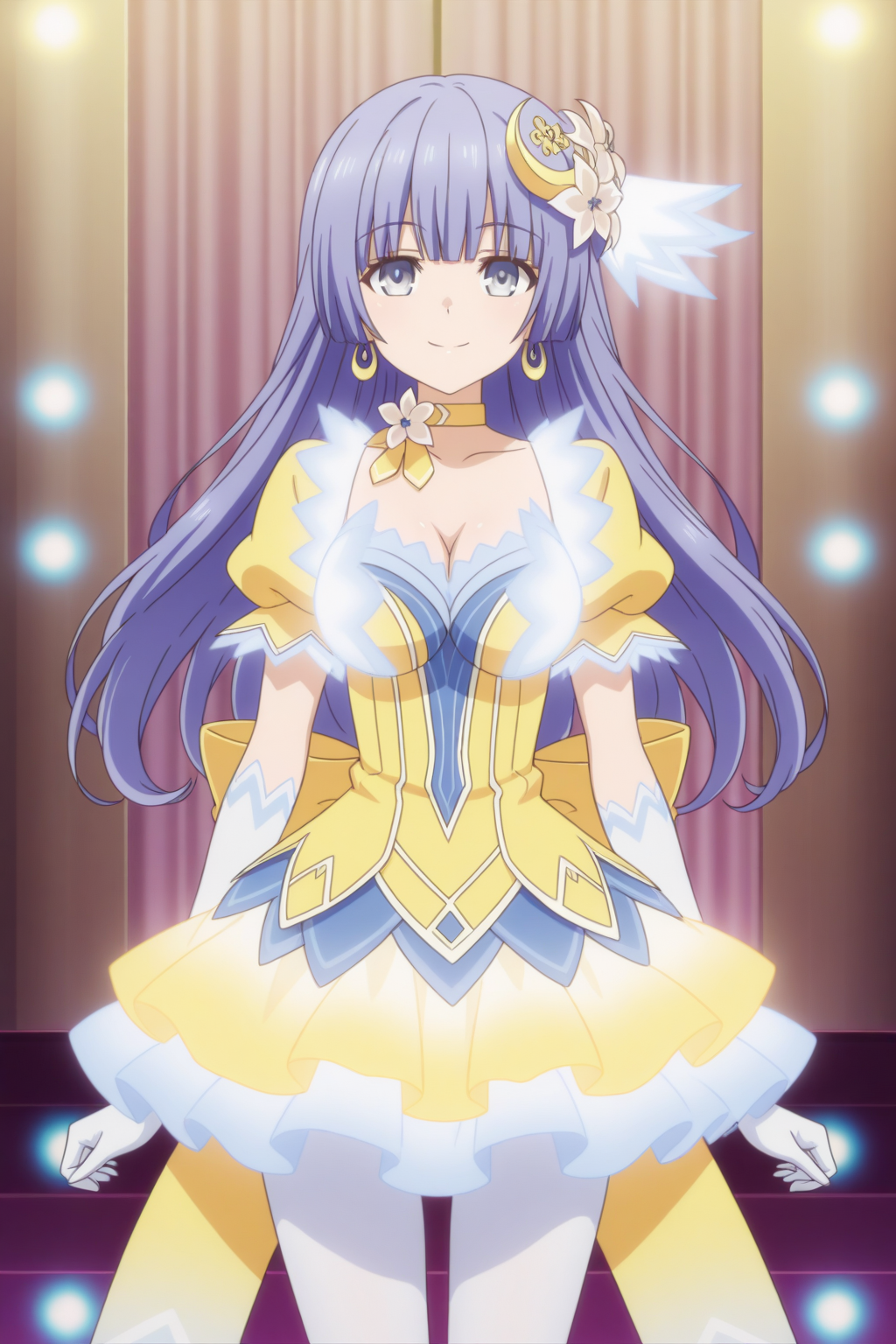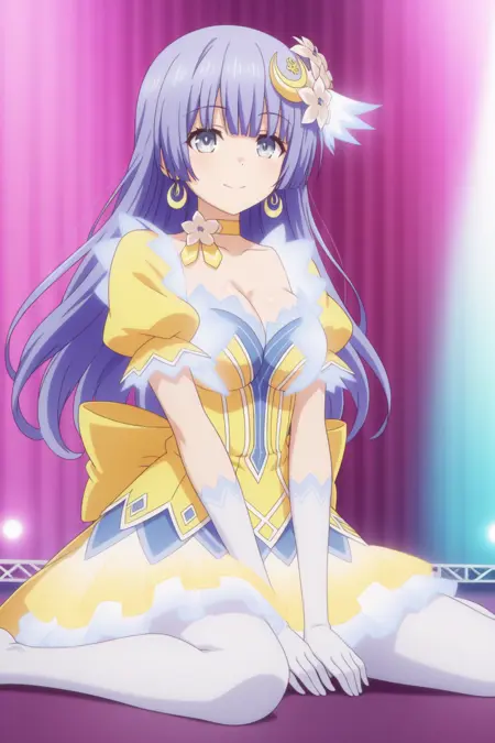 aamiku, 紫色头发, 灰色眼睛, mikuspirit, 新月形发饰, 白色发花, 耳环, 花朵项圈, 黄色项圈, 多色连衣裙, 黄色连衣裙, 蓝色连衣裙, 蓬松短袖, 白色肘套, 背部蝴蝶结, 白色长筒袜, 动漫着色,
