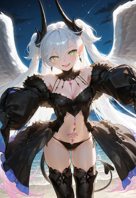 demon horns, demon wings, ear piercing, black hands, medium breasts, black choker, black cloak, open clothes, black panties, black thighhighs, black thigh boots,