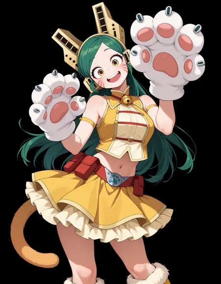 headgear, mechanical ears, whisker markings, facial mark, neck bell, jingle bell, bare shoulders, sleeveless, arm strap, crop top, navel, yellow skirt, frilled skirt, red belt, paw belt buckle, belt pouch, cat tail, paw gloves, knee boots, fur boots