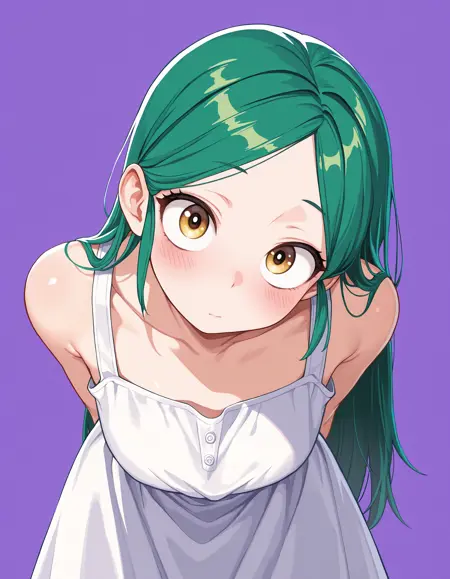r4gdoll, green hair, long hair, yellow eyes, parted bangs, medium breasts