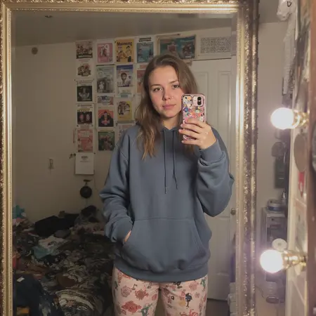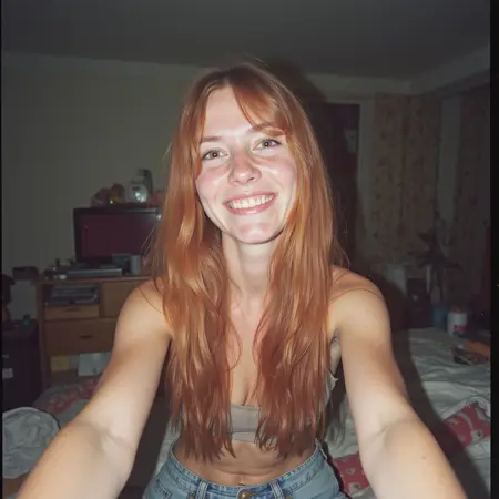 AmateurPhotos90s-77, early 2010s phone selfie of a woman with messy red hair and freckles, smiling casually, cluttered bedroom in the background, soft phone flash, low resolution, nostalgic vibe, slightly blurry, unfiltered, real-life energy