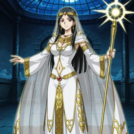 yugioh_card_style, yugioh_card_for_lyla_lightsworn_sorceress, 빨간 눈, 검은 머리, 긴 곧은 머리, 귀걸이, 목걸이, 큰 가슴, 잠금뼈, 배꼽, 가슴 사이, 미소, 헤어밴드, 황금 관, 흰 드레스, 황금 테두리, 의식용 로브, 불어난 소매, 흐르는 망토, 투명한 베일, 황금 자수, 허리 띠, 부츠, 신성한 지팡이, 빛나는 지팡이, 흰색과 황금색 톤