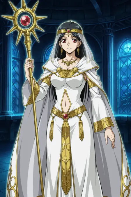 yugioh_card_style, yugioh_card_for_lyla_lightsworn_sorceress, 빨간 눈, 검은 머리, 긴 곧은 머리, 귀걸이, 목걸이, 큰 가슴, 잠금뼈, 배꼽, 가슴 사이, 미소, 헤어밴드, 황금 관, 흰 드레스, 황금 테두리, 의식용 로브, 불어난 소매, 흐르는 망토, 투명한 베일, 황금 자수, 허리 띠, 부츠, 지팡이