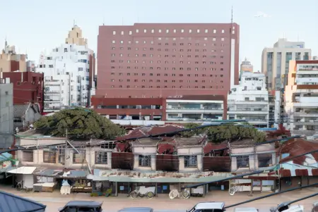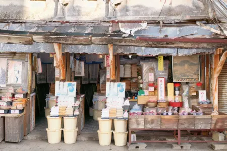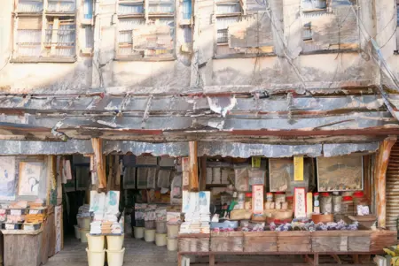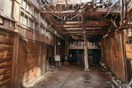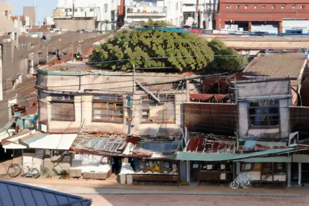 Aozora Shopping Center is a shopping district in Miyazaki City(Japan) with a history of over 70 years. More than 40 stores used to operate here, but the number has dwindled to 5 or 6, and the buildings have become decrepit. A distinctive feature of the area is a large tree that penetrates the old buildings and grows deep green leaves on the rooftop. This large tree and the dilapidated building together create the unique scenery of a blue sky shopping center.