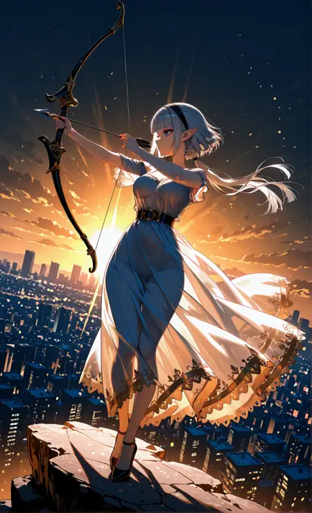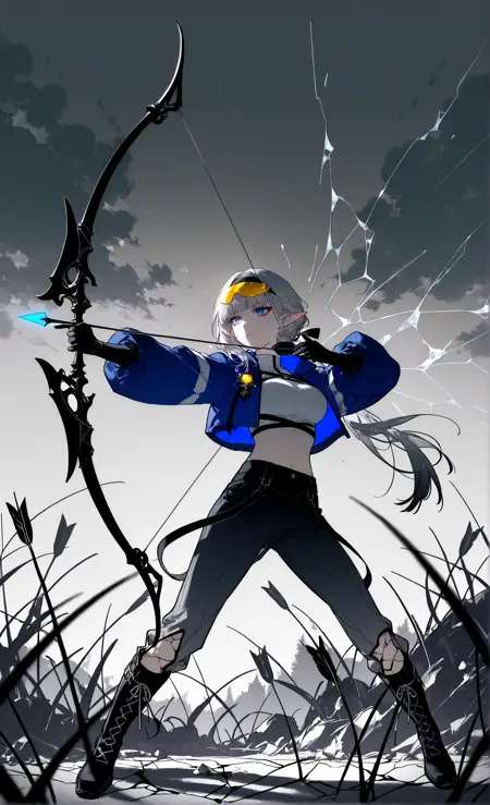 archery, partially fingerless gloves, holding bow \(weapon\), outstretched arm, drawing bow, holding arrow, single glove,