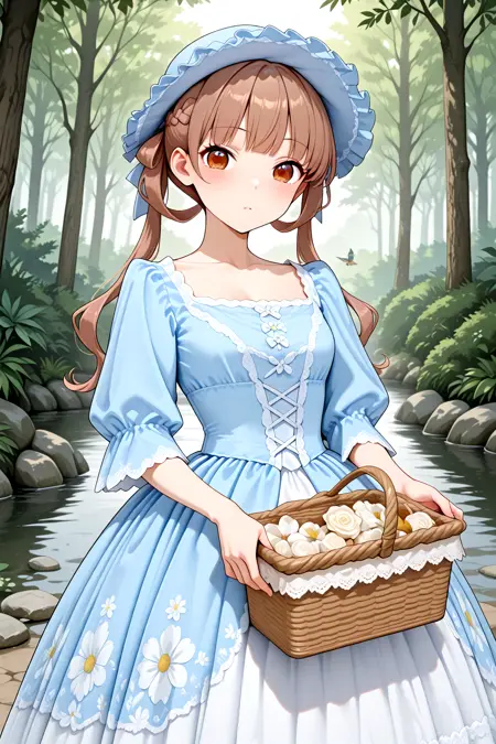 Blue_Rococo_Style_Vintage_Masquerade_Dress, (white dress, blue dress), gown, long dress, blue headwear, bonnet, frills, lace trim, lace, short sleeves, puffy sleeves, floral print