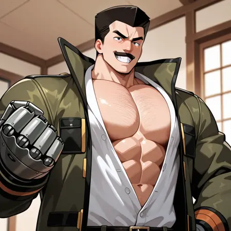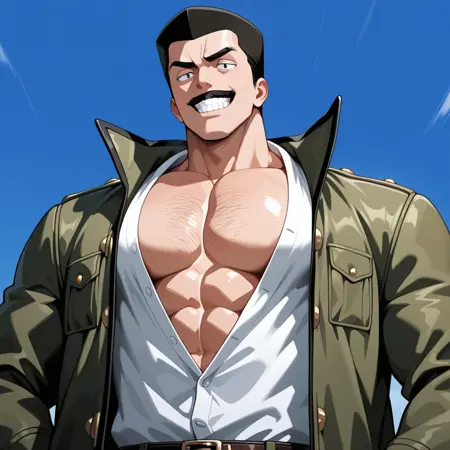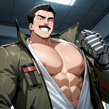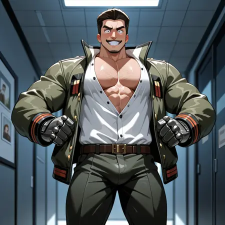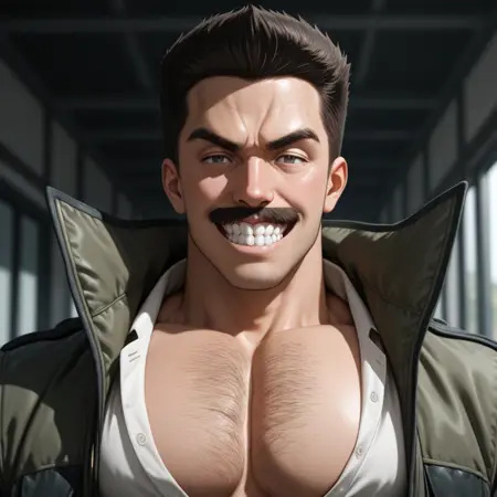 :白衬衫、绿色夹克(部分解开)、胸毛、假手