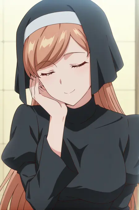 fabinikupriestess, shiny hair, blue eyes, long hair, nun, black dress, turtleneck