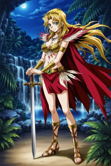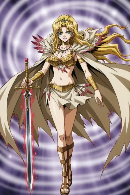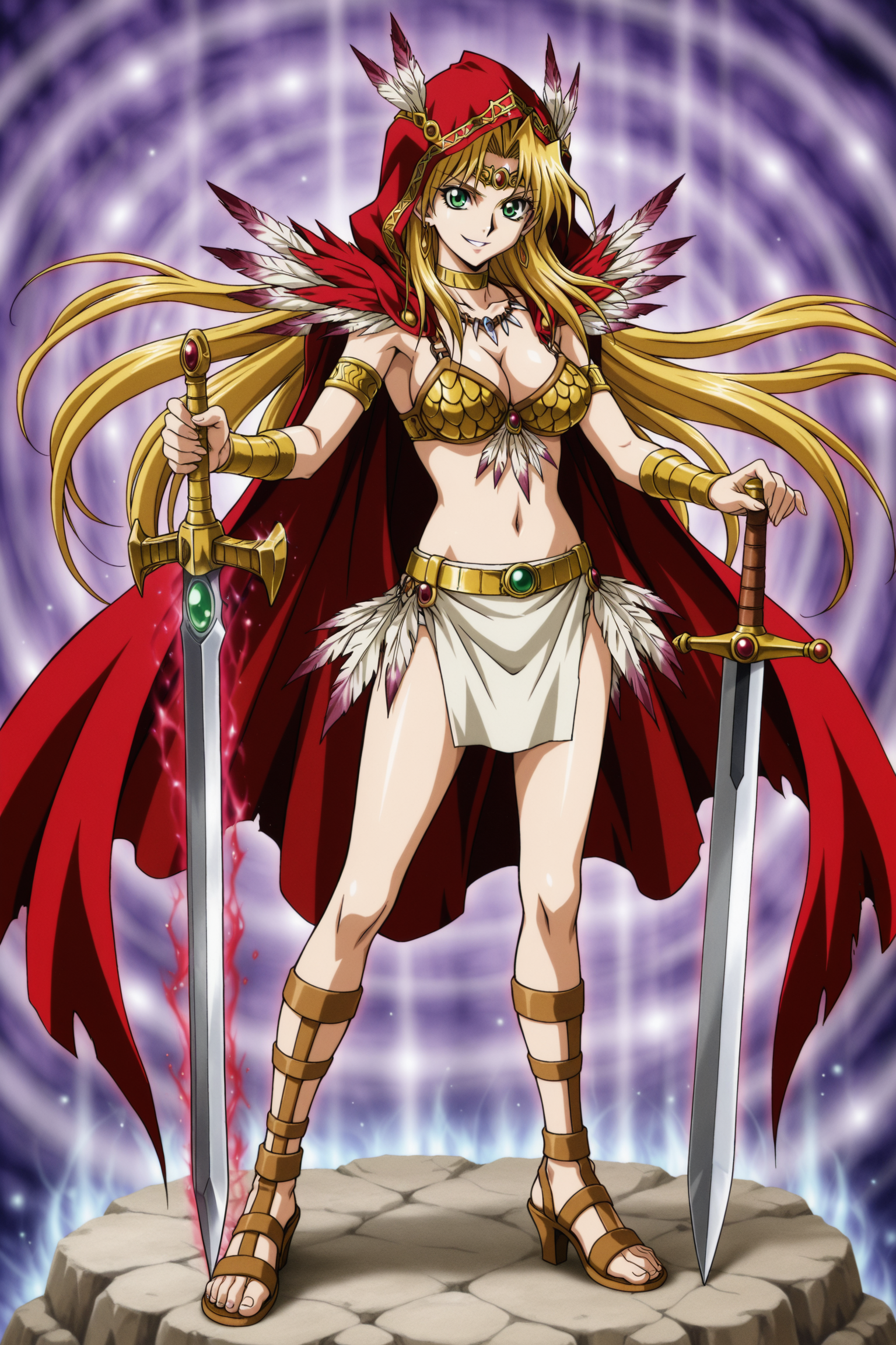 yugioh_card_style, yugioh_card_for_amazoness_paladin, green eyes, blonde hair, long hair, straight hair, flowing hair, earrings, necklace, large breasts, collarbone, navel, cleavage, smile, golden armband, golden choker, golden belt, tribal design, ornamental clothing, bikini armor, asymmetrical outfit, shoulder feathers, feathers on head, two feathers, golden tiara, hooded cape, tattered cape, loincloth, short skirt, layered feathers, high heels, sandals, sword, gemstone on sword