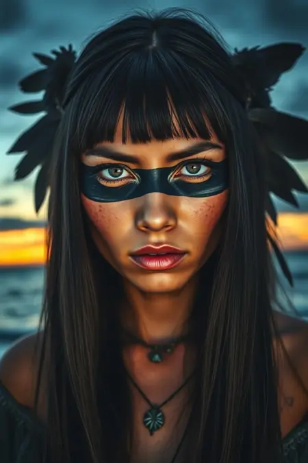 AIネイティブな女性は、フィクションの魔女です。強度は0.4から0.7の間を使用してください。基本的なプロンプトが最適です。例:ストレートで長い黒髪に前髪を持ち、 freckles が詳細に描かれた肌のバンシー女性の上半身ショット。彼女はネイティブ・アメリカンで、薄い茶色の肌色をしており、目元に褪せた黒い顔のペイントの帯を着用し、トライバルな衣装をまとっていますが、彼女の背後は暗く不吉な雰囲気で、海の風景と夕焼けの空が広がっています。彼女の髪には黒いワシの羽が飾られており、立ち姿、シネマティックな写真スタイル