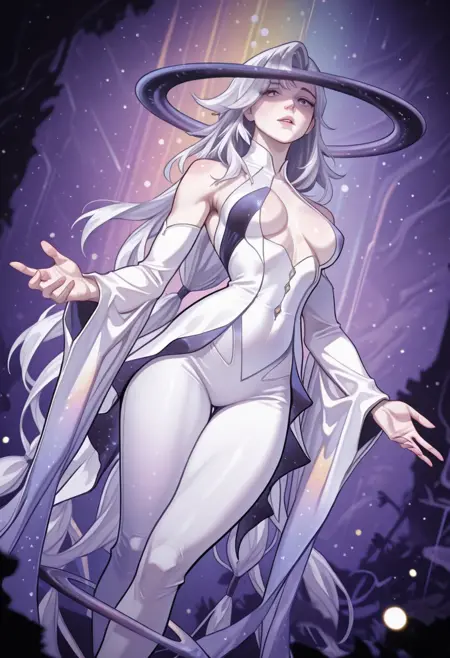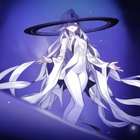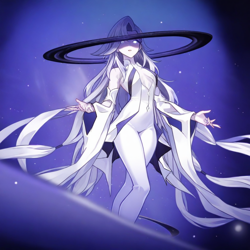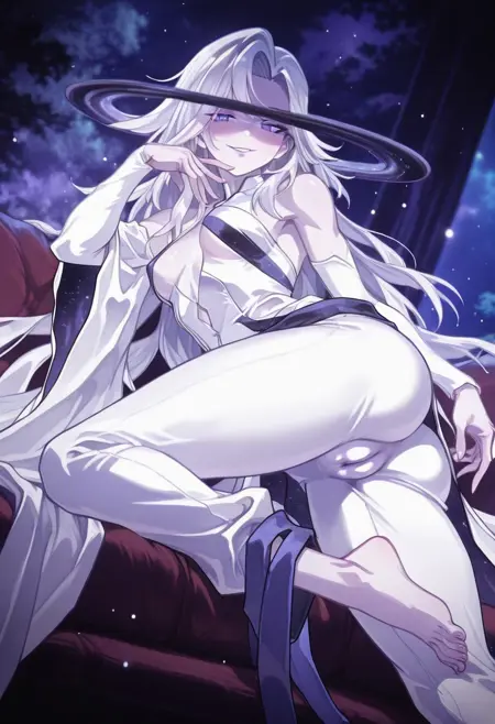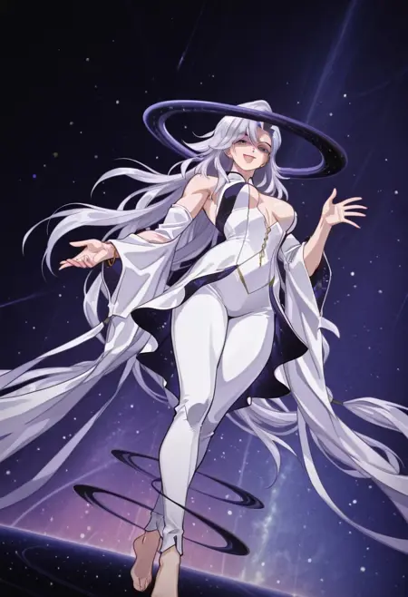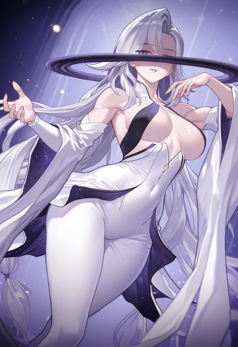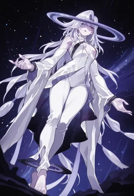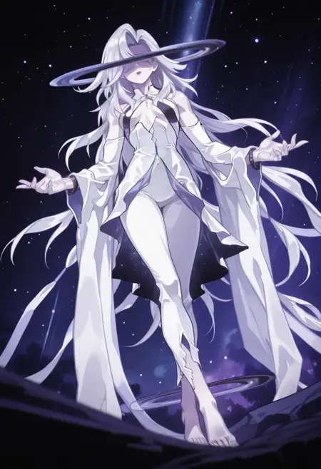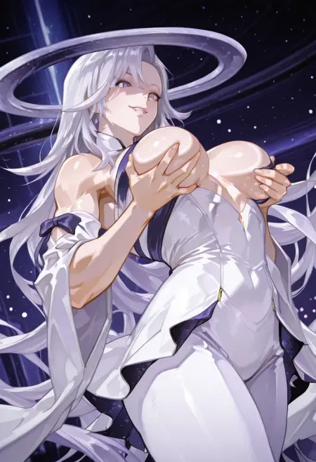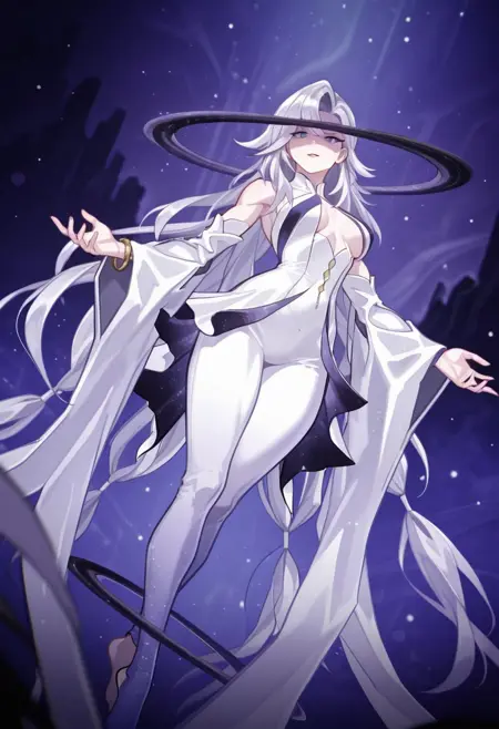 CelenovaHSR, 1girl, solo, very long hair, white hair, bangs, halo, full lips, large breast, white dress, ribbons, wide sleeves, white skinny pants, barefoot, jewelry, detached sleeves,