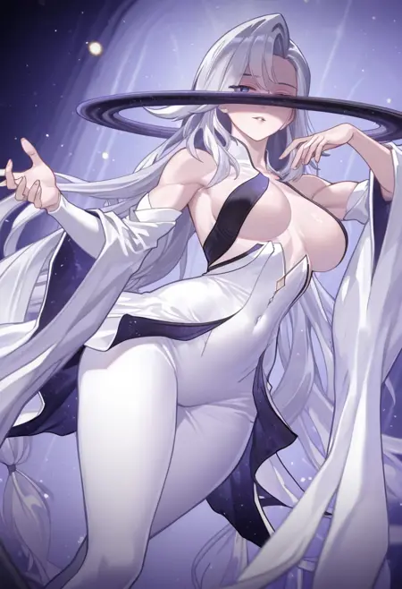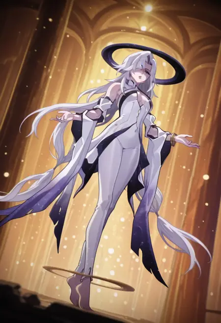 CelenovaHSR, 1소녀, 싱글, 매우 긴 머리카락, 흰 머리카락, 앞머리, 환상, 두꺼운 입술, 큰 가슴, 흰 드레스, 리본, 넓은 소매, 흰 슬림 팬츠, 맨발, 보석, 분리된 소매,