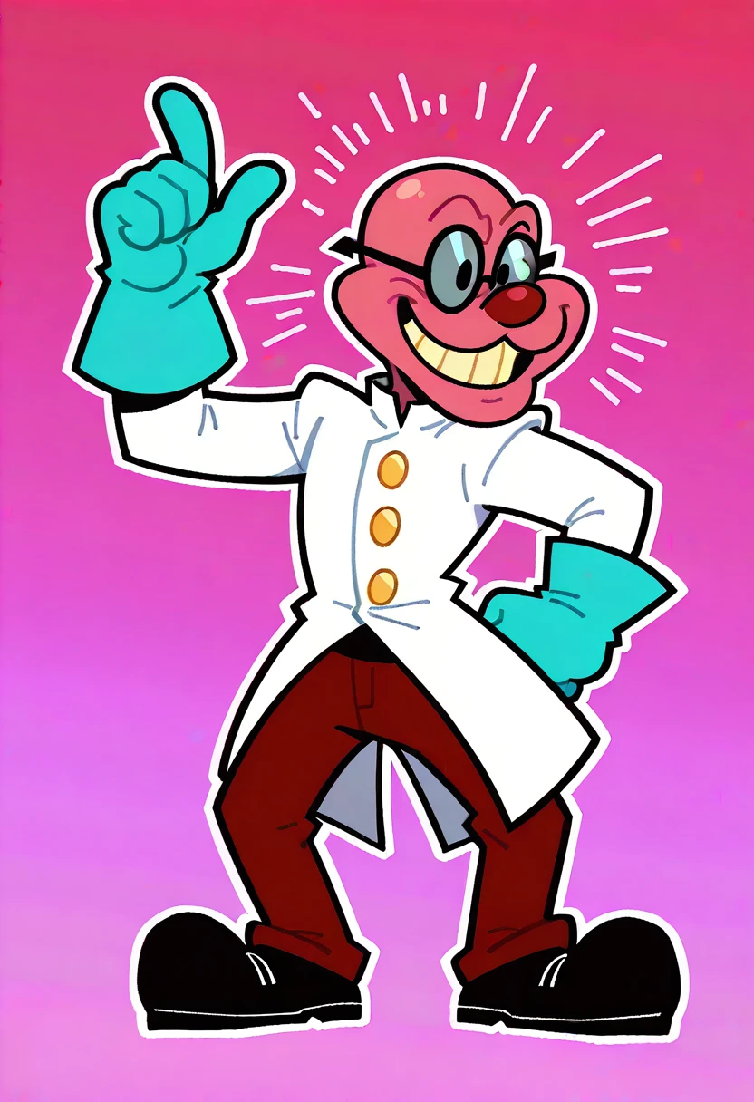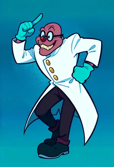 | 训练词汇 | DrWarpnikAOSTH, 1boy, bright red-pink skin, exaggerated facial features, round black glasses, black eyes, protruding light yellow teeth, white lab coat with gold buttons, aqua-light blue gloves, dark red pants, sports yellow small hair, bald, dark red nose,已复制! |