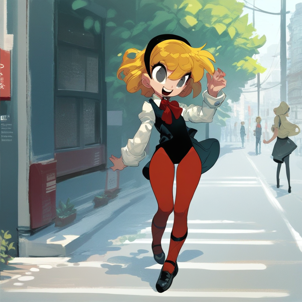 Minnie_gtfdb, minimandy, 1girl, solo, blonde hair, medium short hair, hair bangs, black headband, gray eyes