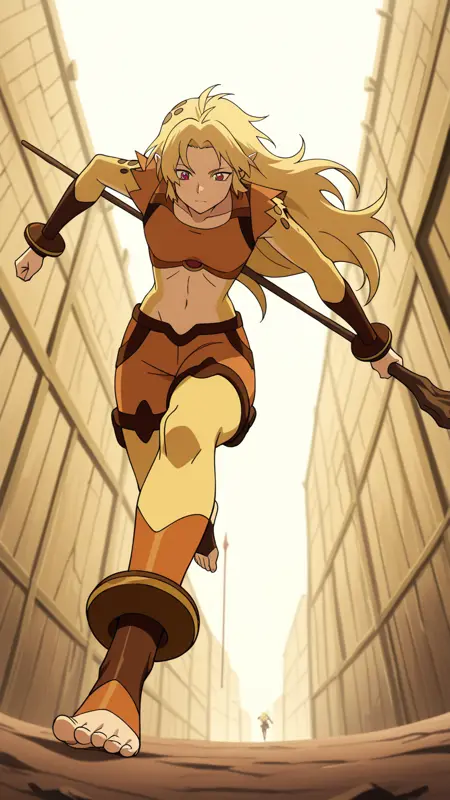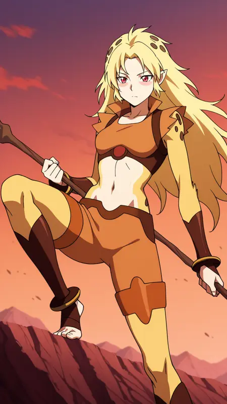 Cheetara, blonde hair, long hair, red eyes, pointy ears, midriff, toeless legwear, anklet, barefoot