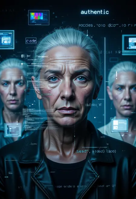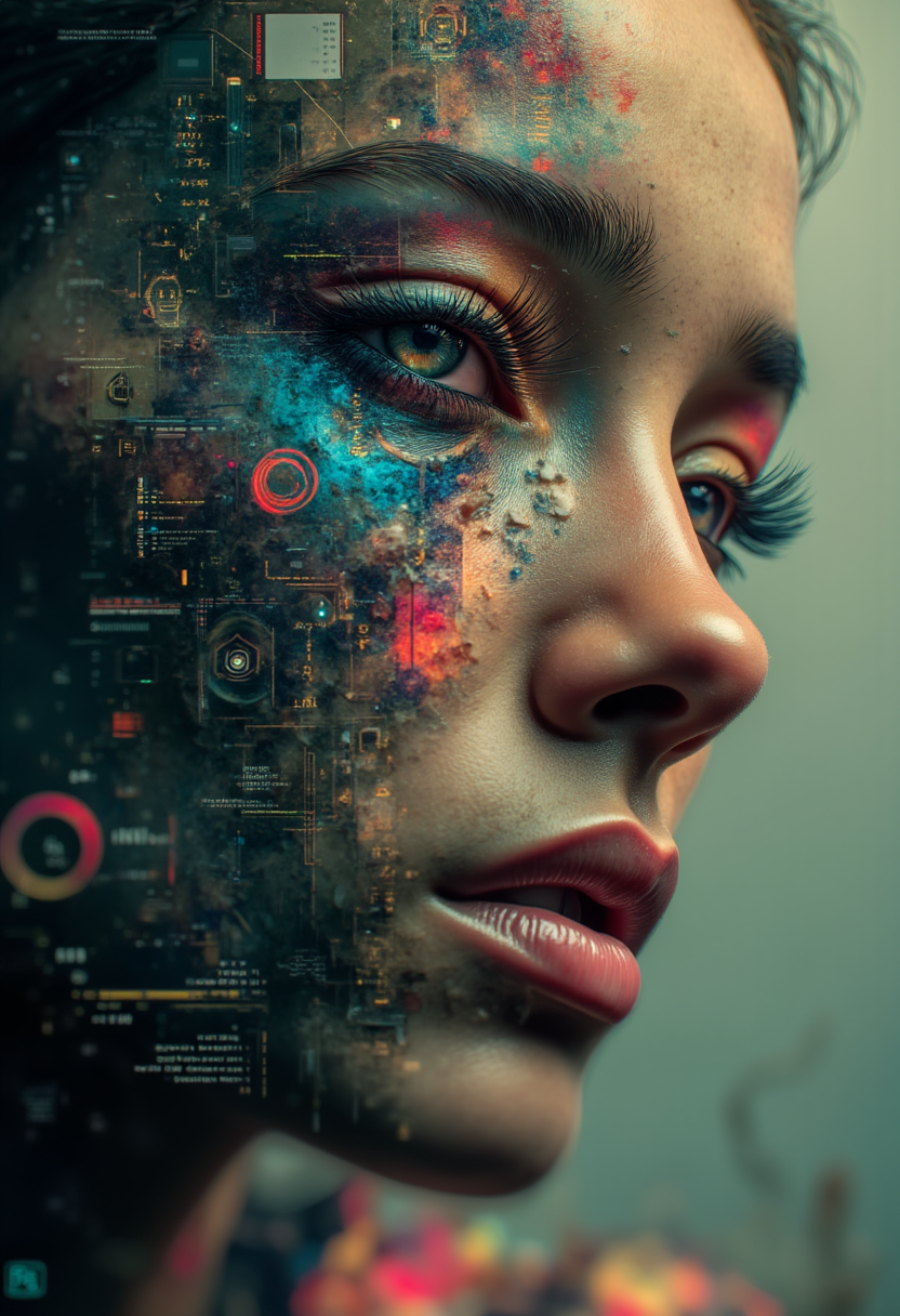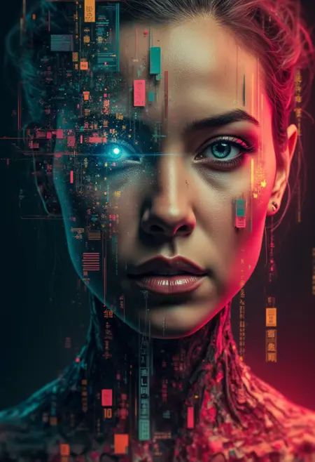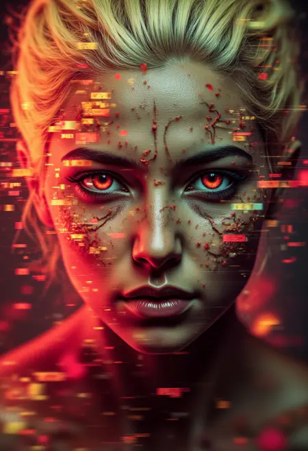 应用高能故障特效、HUD图形、大胆字体和霓虹叠加层——非常适合赛博朋克肖像、科技界面和信号损坏视觉效果。预期出现色差分离、扫描线断裂、图形UI元素和漂浮的文字碎片。