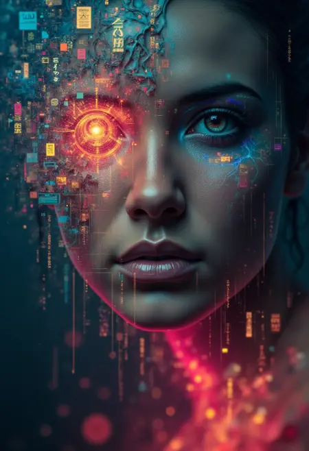 “赛博朋克肖像,她头上有一个未来界面,被故障文字和霓虹叠加层环绕,YFG 超越故障风格。”