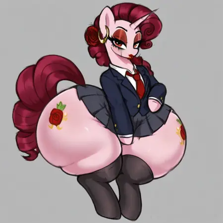 (rareza, 라티나, 유니콘, mlp fim, 암컷 폰이, 자주색 머리카락, 분홍색 털, 머리에 장미, 고리 모양 귀걸이, 컷마크, 무거운 메이크업, 화려함, 유혹적, 우아함, 곱슬머리, 고리 모양 귀걸이, 플라멘코 스타일, 머리에 꽃, 메이크업, 붉은 립스틱, 금 귀걸이, 라틴 아메리카 패션,)