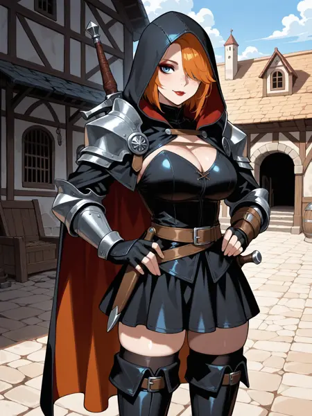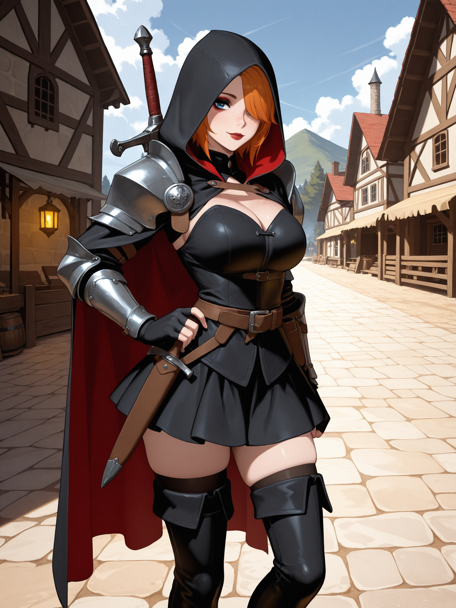 Main Outfit: aldamainoutfit, hood, hood up, cloak, two-sided fabric, armor, shoulder armor, pauldrons, gloves, black gloves, fingerless gloves, gauntlets, skirt, black skirt, thighhighs, black thighhighs, boots, thigh boots, high heel boots, high heels
