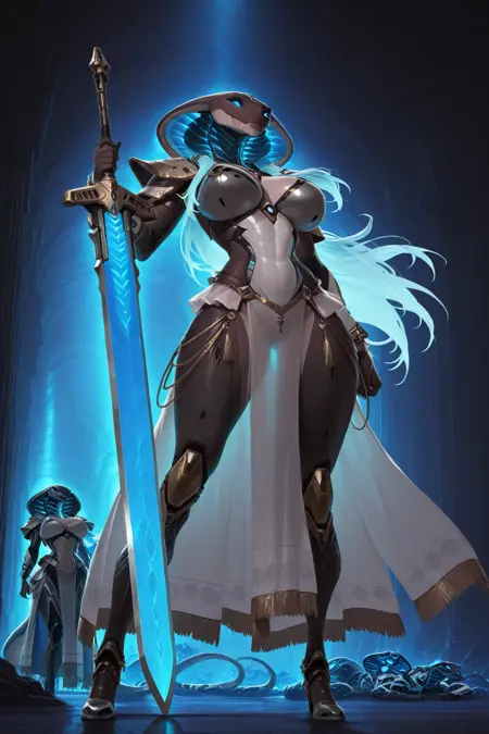 🔹 핵심 특징1girl, Serkron, cobra, furry, living machine, muscular female, large breasts, wide hips, mechanical abs, glowing eyes, glowing blue parts, glowing claws, side locks, glowing light blue hair, shoulder pads
