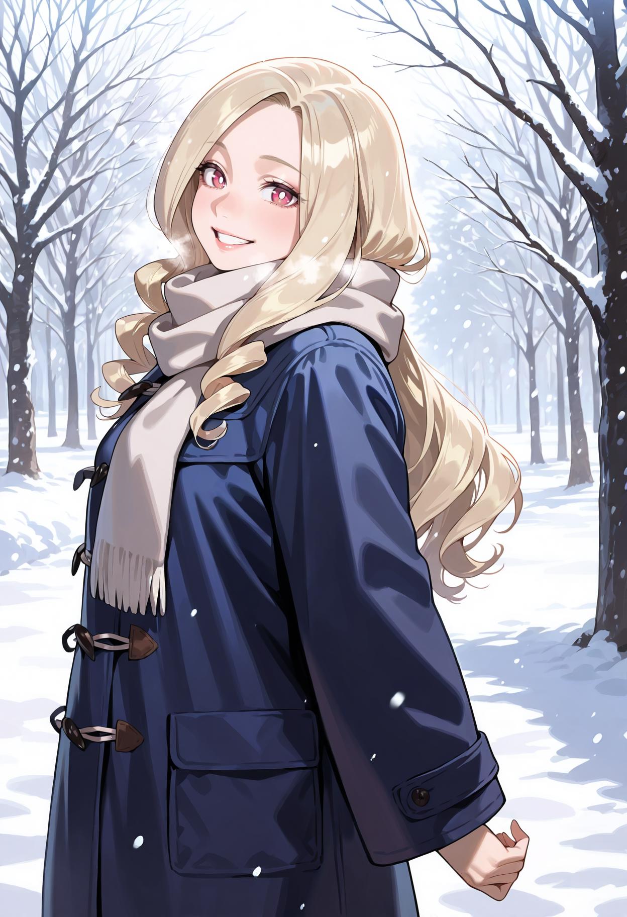 외모: 1소녀, 긴 머리, 금발, 드릴 머리, 분홍색 눈, 밝은 동공, 빨간 눈, 하얀 동공, 앞머리