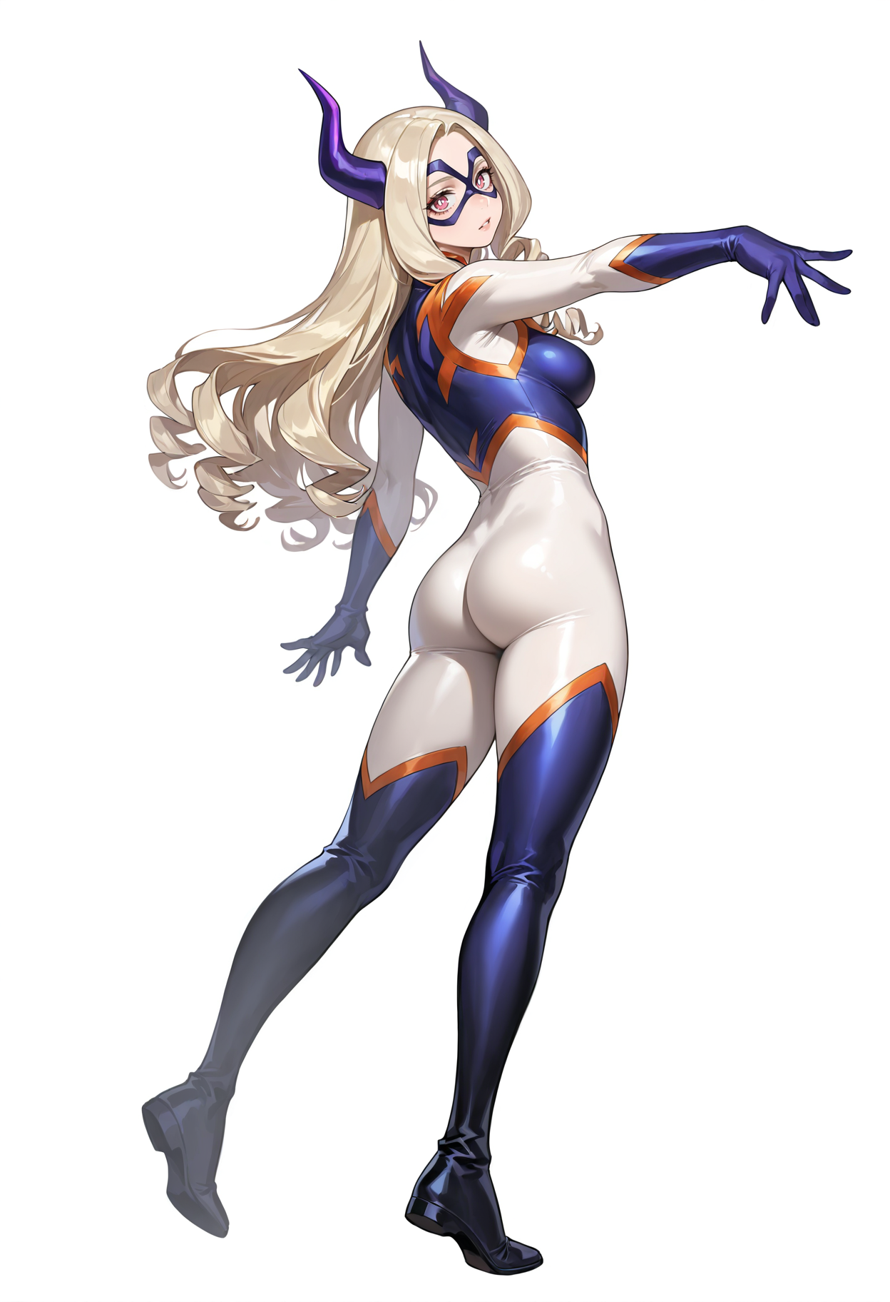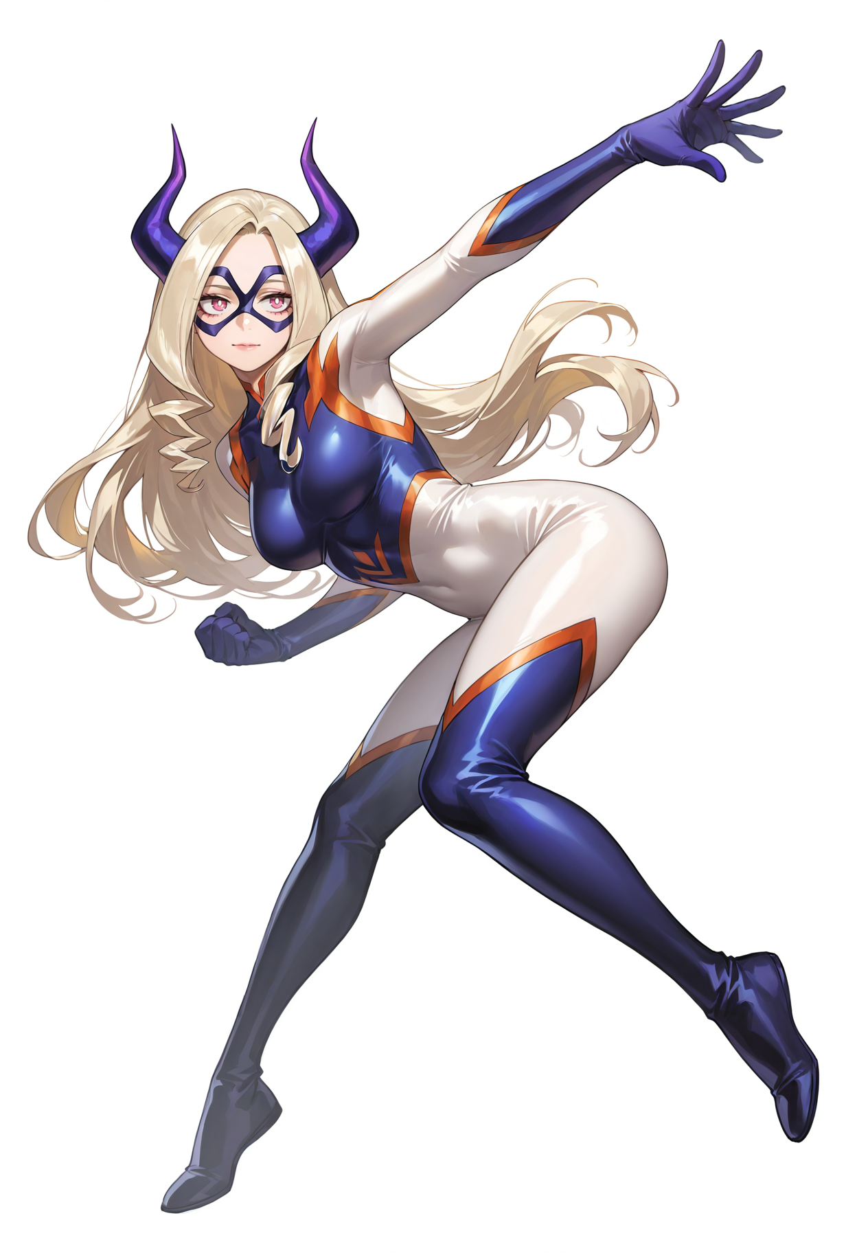 복장: 마스크, 도미노 마스크, 바디수트, 가슴, 장갑, 중간 크기 가슴, 꼭 맞는, 허벅지 부츠, 부츠, 허벅지 길이 양말, 슈퍼히어로, 흰색 바디수트, 보라색 뿔
