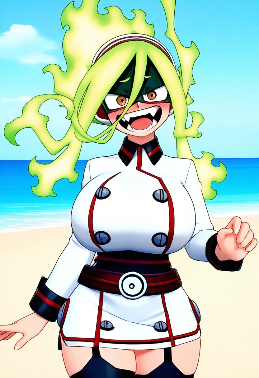 burnin, 1girl, solo, long hair, breasts, open mouth, long sleeves, dress, thighhighs, hair between eyes, yellow eyes, teeth, green hair, artist name, black thighhighs, twitter username, buttons, mask, watermark, glowing, garter straps, fire, glowing eyes, domino mask, eye mask, fiery hair, glowing hair, green fire, floating hair, headphones, black mask