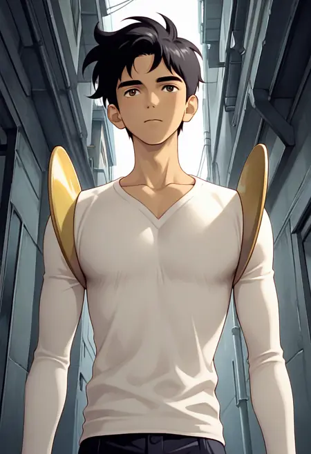 black hair, brown eyes, white shirts, long sleeve, shoulder armor, belt, navy pants, gray shoes,