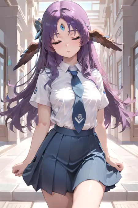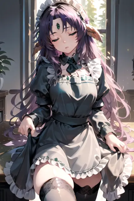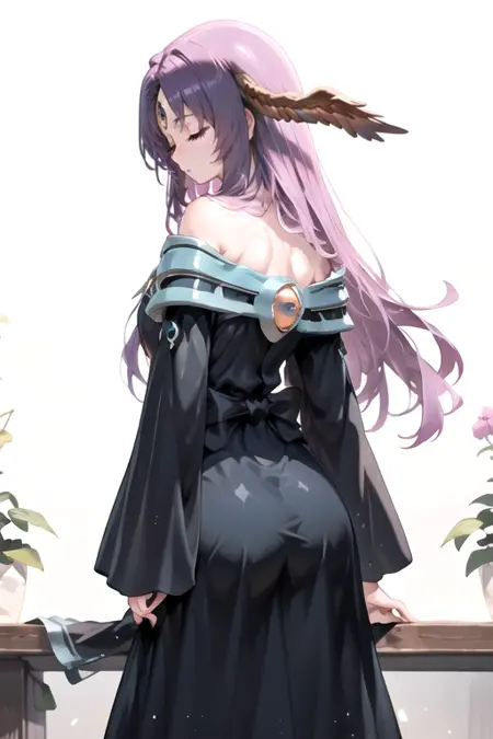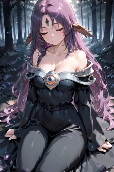Some more tags to make sure you get the full look: third eye, long hair, parted bangs, head wings, closed eyes, black dress, long sleeves, gem, wide sleeves, off shoulder