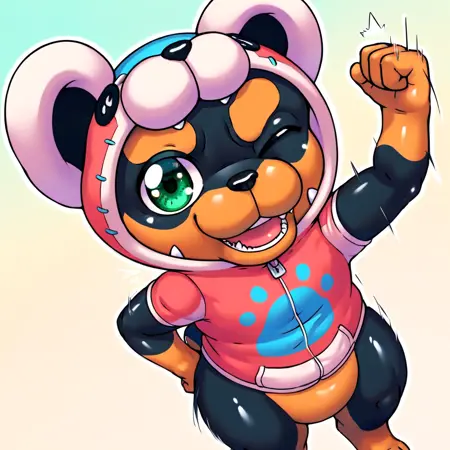 附加提示词:罗特威勒犬、兽人、熊形连帽衫、双色身体、黑色身体、棕毛、绿色眼睛、无下装、短尾巴、毛茸茸、犬类、下半身丰满、断尾、短袖、多色连帽衫、黑色爪子、黑色脚垫