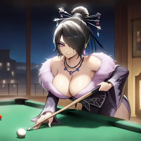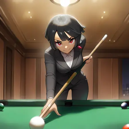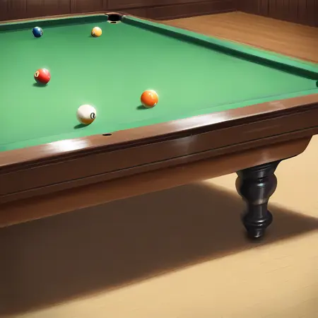 추가: 풀 테이블, 빌리어드 공, 큐 스틱을 든 상태