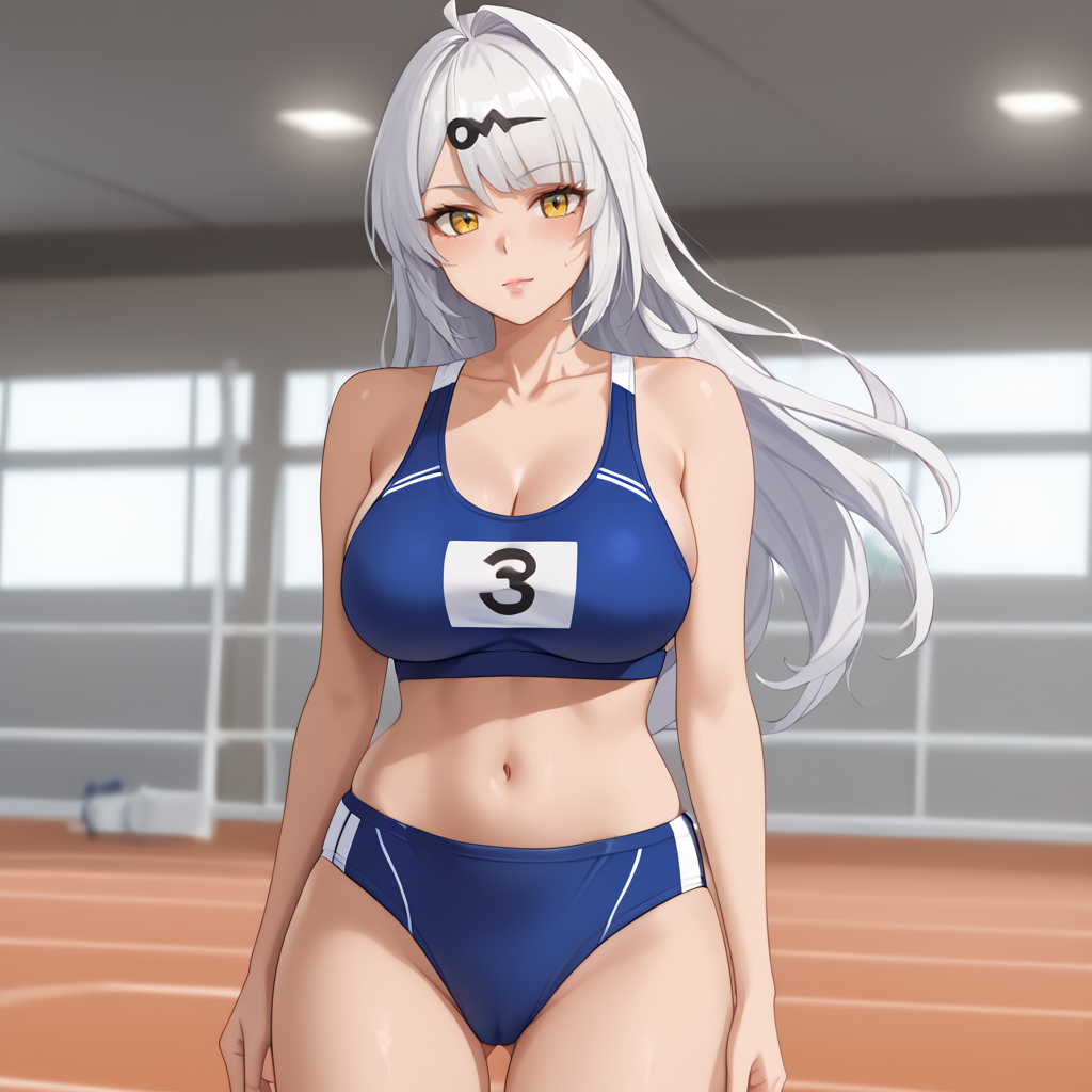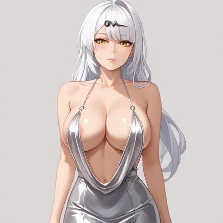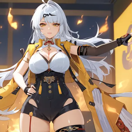 2D用トリガー: Yixuan2d, 1girl, large breasts, black gloves, yellow jacket, cleavage, black thighhighs, yellow eyes, single thighhigh, fingerless gloves, elbow gloves, white hair, bangs, hair ornament, thighs, open clothes, shorts, thigh strap, open jacket